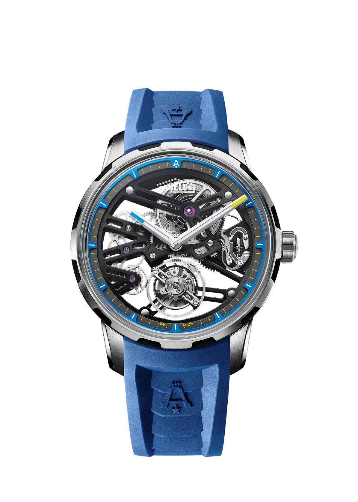 One of its last creations is the Angelus U41, a sporty, tourbillon skeleton type watch which comes in a 42 mm titanium case. With an A-300 calibre, the design has ‘dual-beamed’ plates and bridges for this one-minute flying tourbillon. The void that separates the two arms from these supporting elements is studded with jewels that accommodate the wheel axes. Angelus movements frequently exhibit 90-hour autonomy, enabled by a balance oscillation speed of 3 Hz. For the A-300 calibre, the frequency has been set at 4 Hz for 60 hours of power reserve. This higher frequency safeguards the accuracy of the movement during impacts, and thus reduces its power reserve.