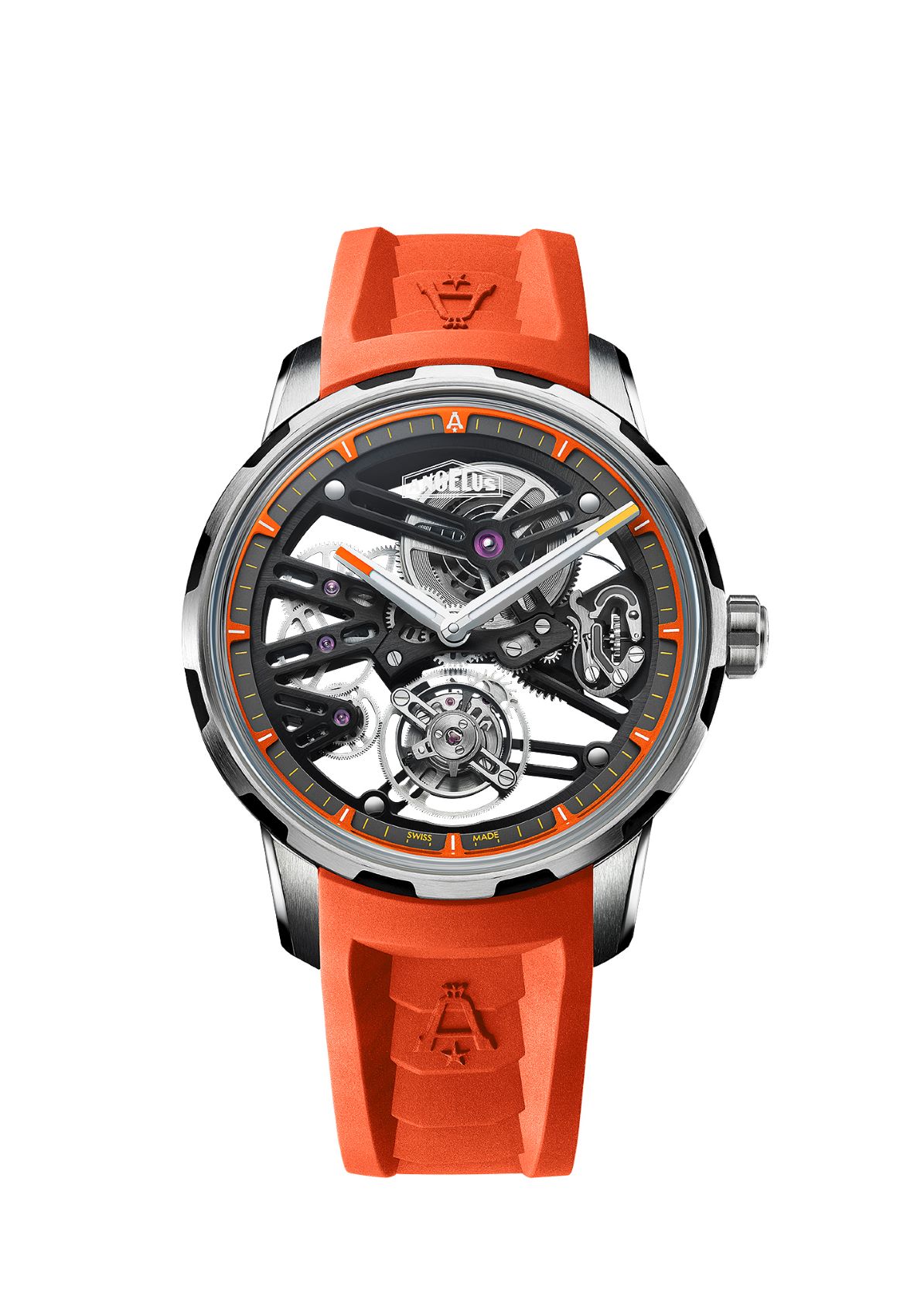 The U41 comes in two versions: one dressed in orange hues, and another in a range of blues illuminated by flashes of yellow on the minutes hand and minute circle. White SuperLumiNova coats the hours and minutes hands. The rubber straps work beautifully with the dominant colors. There are 25 pieces in each color. Suggested price: CHF 31,700 .00