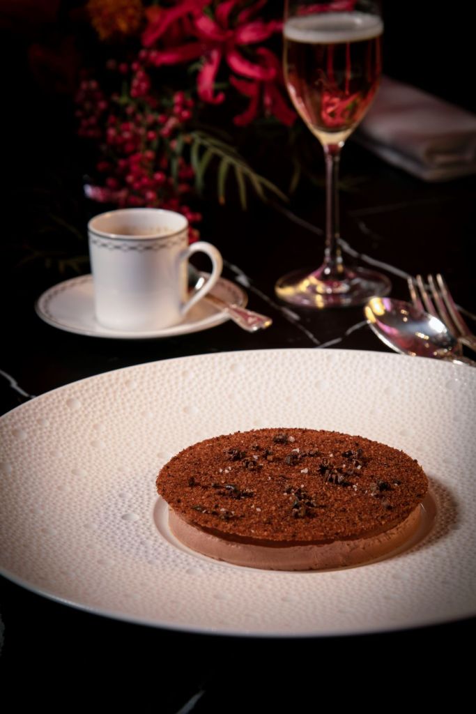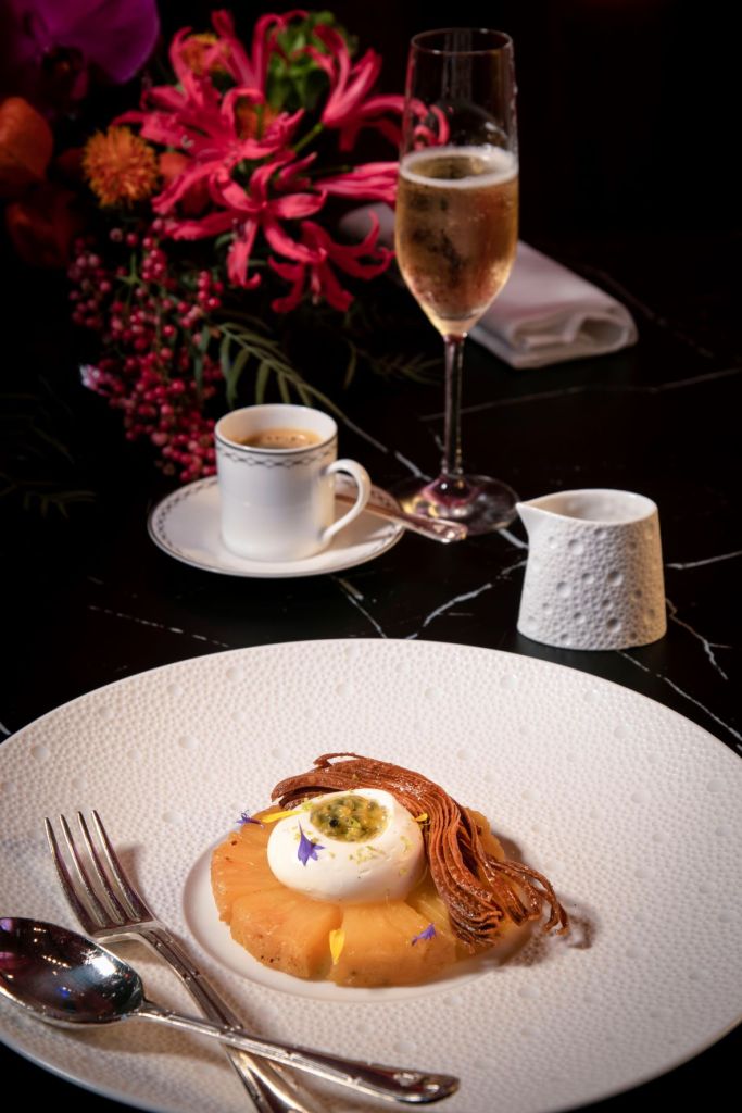 Desserts created by Anne Coruble, in charge of all sweet confections at The Peninsula Paris, follow a similar mixing of origins: Crispy chocolate tuile, ginger condiment and chocolate sorbet; Roasted pineapple with Madagascar vanilla ganache and fresh passion fruit; and mango poached in its own juice with fresh herbs sorbet.