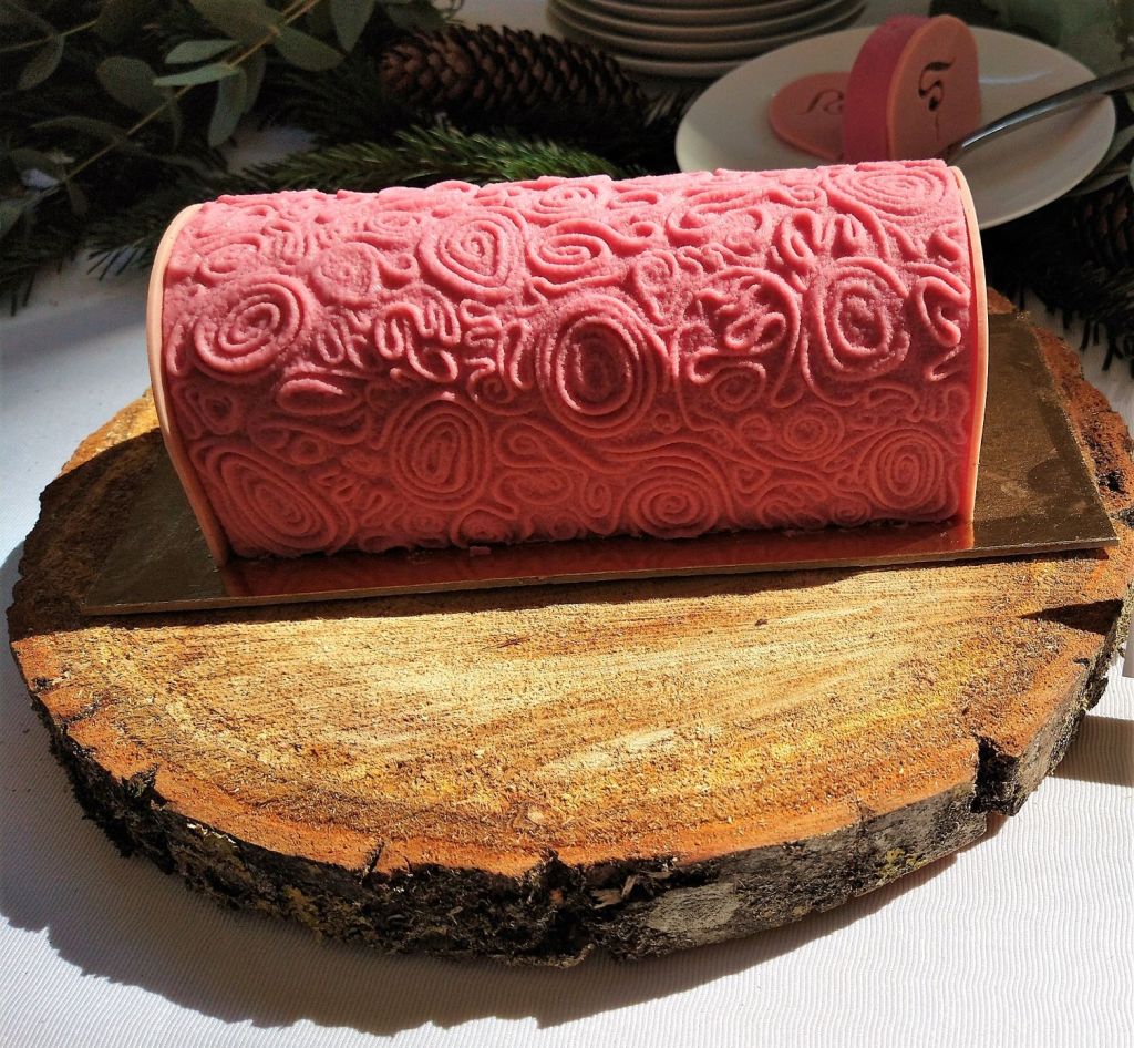 Pour cette création le biscuit viennois est roulé à la marmelade de framboises, une ganache allégée à la framboise enveloppe cette bûche, qui repose sur un riz au lait de coco à la vanille de Madagascar.