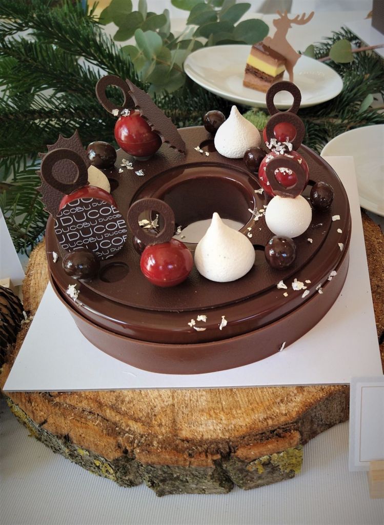 Ducobu, l’ambassadeur du chocolat belge, a conçu une bûche allégorique pour la saison : une couronne de Noël. Il s’agit d’une pièce forte en chocolat composée de mousse chocolat et praliné amandes, crémeux biskélia (goût biscuité) feuilletine au chocolat et biscuit au chocolat. La couronne est ornée de petites feuilles de houx et de jolies boules de Noël.