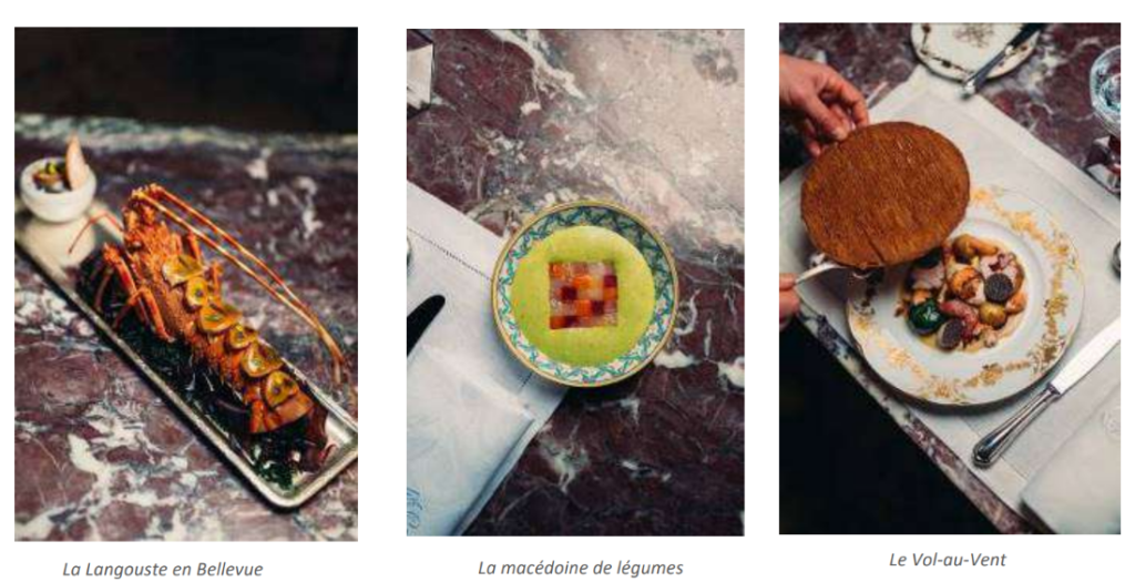 À la carte du restaurant, chaque plat fait référence à une recette iconique du patrimoine. Les énoncés historiques sont restés inchangés pour permettre aux convives de laisser place à leur imagination et d’être ainsi transportés dans l’expérience à venir. Par exemple, la « Langouste en Bellevue », est accompagnée d’une macédoine de légumes, qui arrive majestueusement en salle tout en arborant, sur son dos, une cascade de médaillons traités en gelée; ou au potage « façon Dubarry », marié à de petits coquillages de Bretagne en civet.