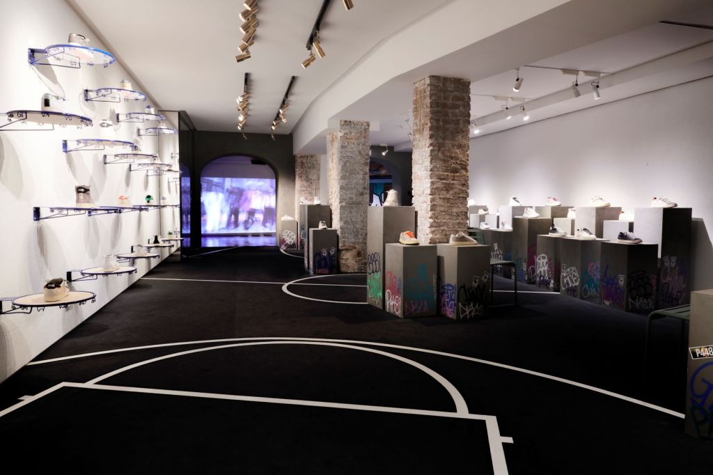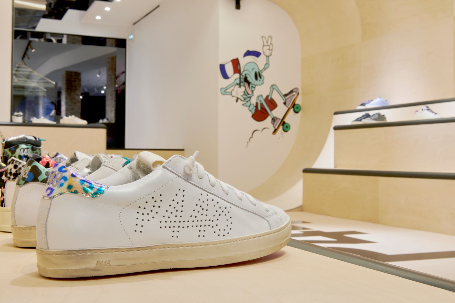 The Paris store offers men’s and women’s footwear, apparel, and accessories. The 4,500 sq ft P448 Paris experience is composed of three different environments on the ground floor, a showroom on the second floor, and a hidden room where you can enjoy a shot of coffee or cocktail. The store’s purposefully relaxed and playful design includes an in-store skate ramp and work by a range of international street artists. Artists include Paris’ Pakone, UK’s Gone and LA-based British Artist Spraying Bricks.