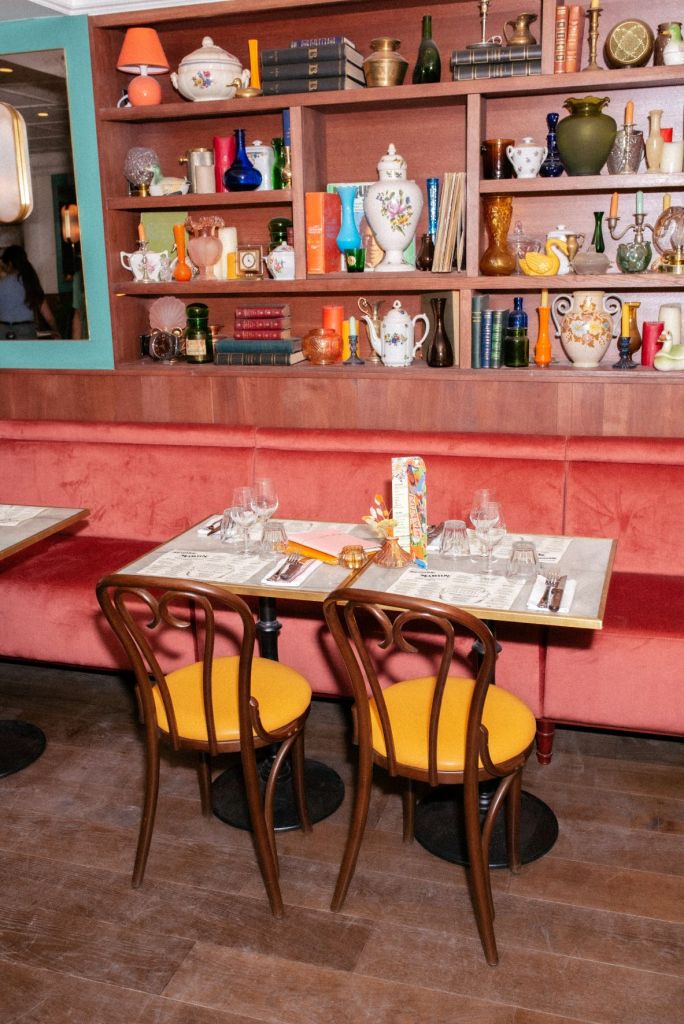 Deux nouveautés à signaler : la rôtisserie, faite sur-mesure par le maestro Rotisol, le king en matière de rôtisserie, et Le labo de la charcuterie, un endroit sous-sol pour créer une spécialité bourguignonne. Il faut dire aussi que tout le mobilier est français et sur mesure : chaises bistrotières, tables rondes cerclées laiton brossé finition marbre blanc nervuré et banquettes gainées de velours pourpre. Au-dessus d’elles siègent étagères style cabinet de curiosités follement approvisionnées d’objets débusqués ici et là auprès de brocanteurs d’Île-de-France.