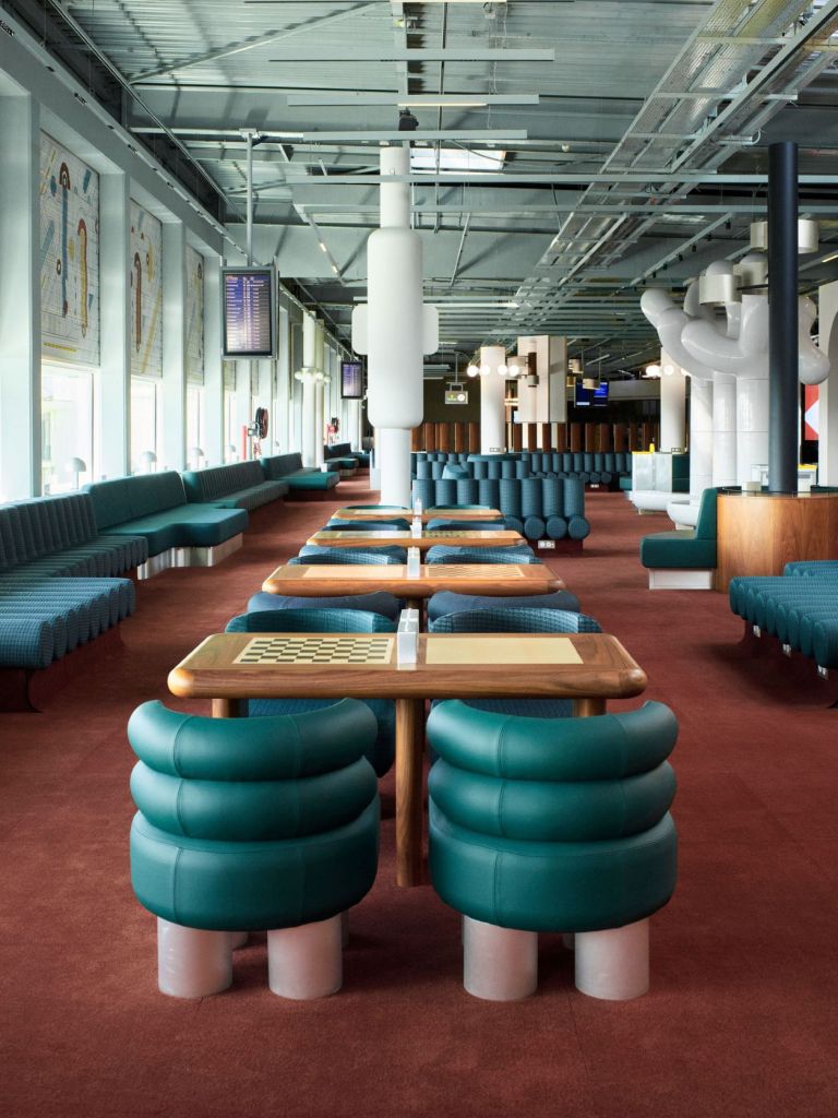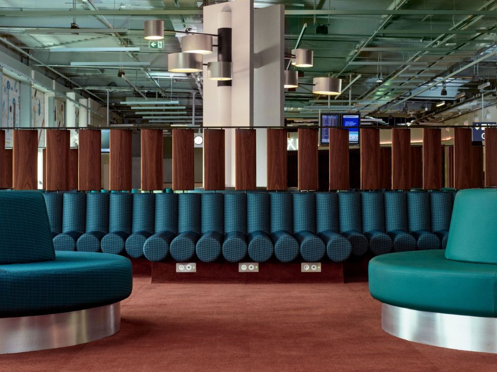 Cette harmonie se retrouve également dans le choix des tissus utilisés sur l’ensemble du mobilier. La Maison Thévenon a spécialement réalisé une gamme de tissus pied-de-poule qui s’inspire fortement de l’aérien : de petits avions stylisés ont été incorporés à un jacquard extrêmement résistant. Différents coloris sont utilisés dans la salle d’embarquement du terminal, émeraude, ardoise ou bien encore laiton.
