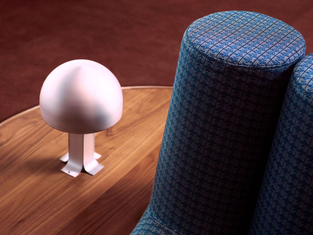 Pour poursuivre et aller encore plus loin dans l’imaginaire, Dorothée Meilichzon a créé un univers aérien onirique et feutré, qui se compose de nombreux éléments : des fauteuils qui s’inclinent, comme dans les avions, l’utilisation de l’aluminium (qui rappelle les carlingues d’avion d’antan) pour la création de lampes champignon typiques des années 1920, le réemploi et le détournement des trolleys utilisés par le personnel de bord en… poubelle. Le tout forme un ensemble cocon et cohérent.
