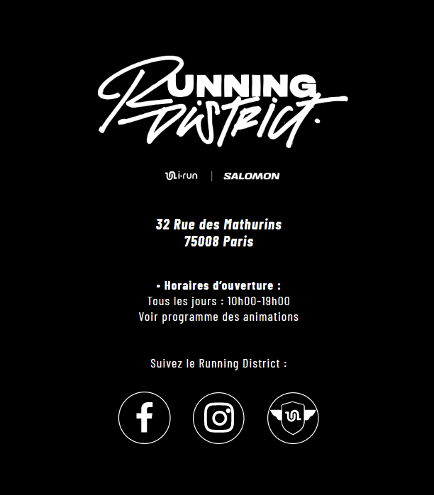Localisée au 32, rue des Mathurins, dans le 9ème arrondissement de Paris, l’endroit prévoit une expérience très complète pour les amateurs de la course sur route. L’espace de 250 m² accueillera pendant presque deux semaines, tous les pratiquants novices et expérimentés sous un nouvel concept. Au Running District on pourra retrouver non seulement la gamme « road running » Salomon sinon qu’il sera aussi possible d’assister à des masterclass inédites, tester les chaussures, participer aux rencontres animés par les développeurs de la marque, les athlètes et les personnalités engagées avec ce sport.