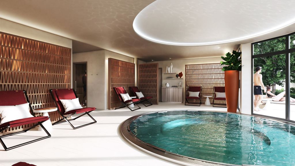 A cette inspiration d’Orient s’ajoute la modernité au travers de mobiliers contemporains et le traitement de murs en bois qui viennent rythmer le projet et apporter de la chaleur. Le spa dialogue avec la nature par la position du bain à remous qui est posé devant le paysage. Sa cuve en acier prenant des couleurs vert d’eau en harmonie avec les vignes. Cette évocation de la nature est aussi sublimée au travers de grandes œuvres mettant en avant les éléments forts de l’environnement dans lequel s’inscrit le projet. Des détails d’écorce, de bois, de terre aux couleurs terracotta viennent habiller les murs dans tout l’univers du spa.