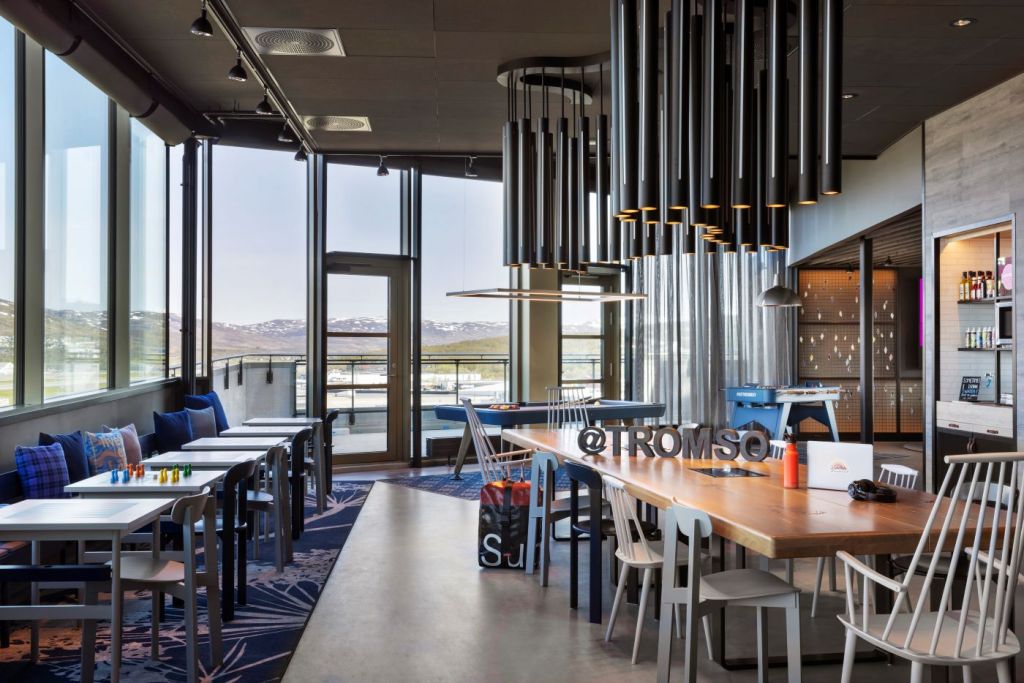 Les designers danois Mette Fredskild Studio se sont inspirés de la région, de la vue imprenable sur le fjord et les montagnes au-delà, des couleurs des vêtements folkloriques traditionnels locaux (l’indigo, le cobalt et le bleu), auxquelles ils ont ajouté des couleurs plus chaudes, notamment le violet, le marron et le rouge profond pour créer un univers industriel élégant. Les peintures murales dans les espaces publics, créées par les artistes locaux Alice Kvalvik et Jonathan Broca, illustrent de manière ludique la vie à Tromsø et l’environnement naturel avoisinant.