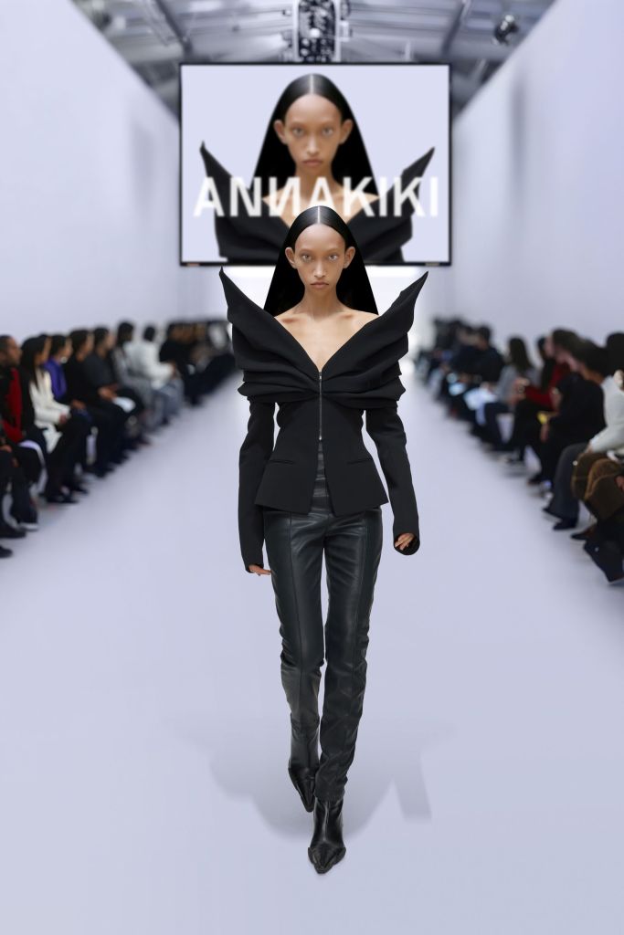 Imagining living in an era where artificial intelligence and humanity coexist and thrive, Anna has created a series of futuristic warriors wearing armor, symbols of power that subvert traditions and question the conventional, bravely fighting against the excessive invasion of artificial intelligence while protecting the precious creativity and imagination of humans. This season, Anna has committed to challenging the new limits of silhouette design, using only black and white as the main colors to explore the infinite possibilities of the absolute. In addition to common materials like leather, coated denim, and composite materials, she actively introduced new technological fabrics. The first nine looks of the runway were inspired by the concept of “shell,” emphasizing that while artificial intelligence can create, it lacks emotions and soul, producing only soulless “shells.” Based on this concept, Anna used a variety of composite fabrics like fishbones and combined materials of leather and aluminum, combined with three-dimensional stitching technology, to create designs with wide silhouettes and unique visual effects.