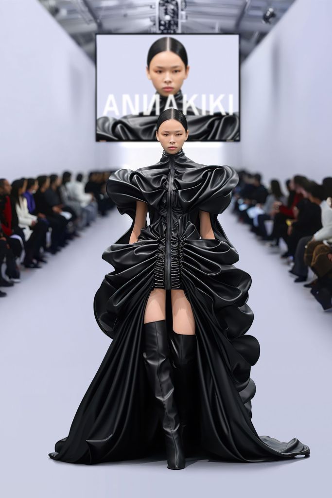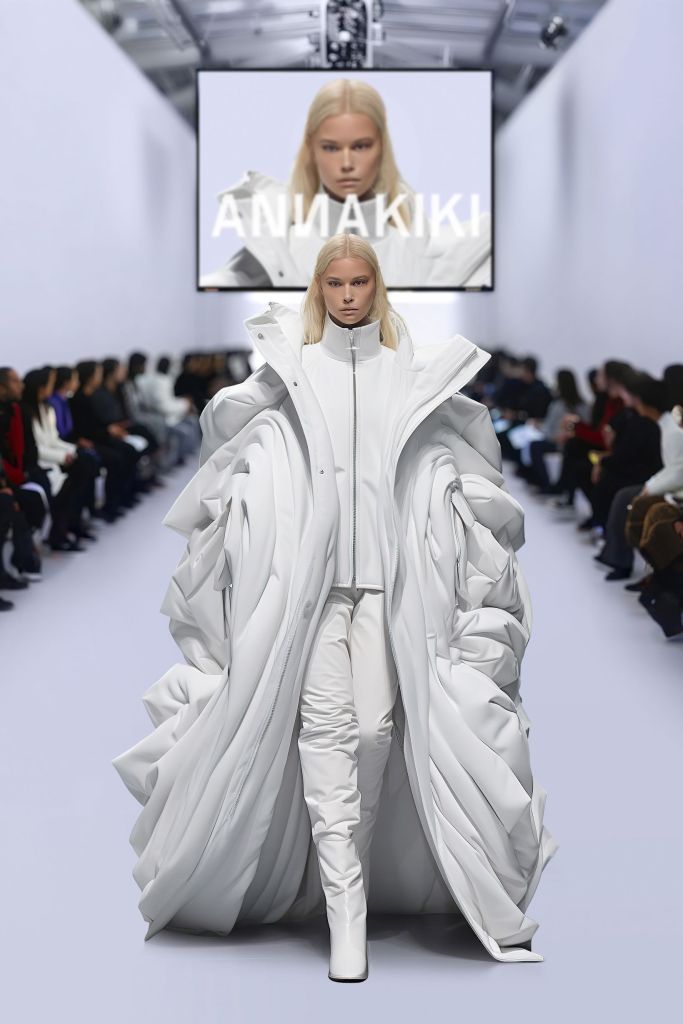 The ANNAKIKI Fall-Winter 2024 collection by Anna Yang is themed “the era of artificial intelligence” and presents 50 looks in a retro-futuristic style through a digital runway format, exploring the theme of coexistence and co-creation between artificial intelligence and humanity. This season, she used the fusion of real photography and AI technology as a creative concept, creating a virtual runway from set design to audience, and specially presenting eight virtual looks generated with the assistance of AI. The innovative capacity and broad imagination demonstrated by AI have left the designer amazed. What originally required a week or more of work can now be accomplished in an extremely short time thanks to AI technology, and the reality of the finished products is difficult to distinguish. This seems to herald a significant reduction in the technical complexity of design, allowing anyone in the future to design their own clothing line thanks to the power of technology.