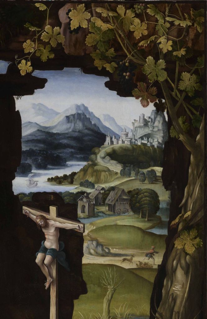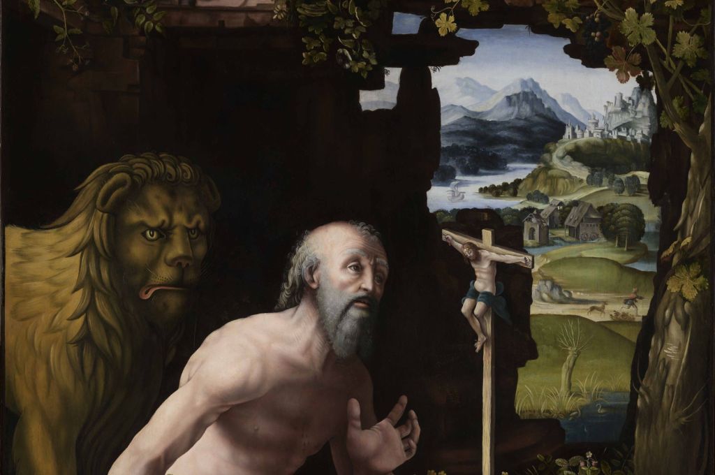 The painting takes up the classic Renaissance depiction of Saint Jerome as a hermit, shown largely unclothed and praying in a landscape. But what sets this painting apart is the extraordinary precision shown in the treatment of the landscape, where no fewer than thirty-eight species of plant can be identified. This extreme attention to the landscape and to the details of flora and fauna is characteristic of the works produced by Leonardo da Vinci’s Milanese disciples between 1510 and 1530.