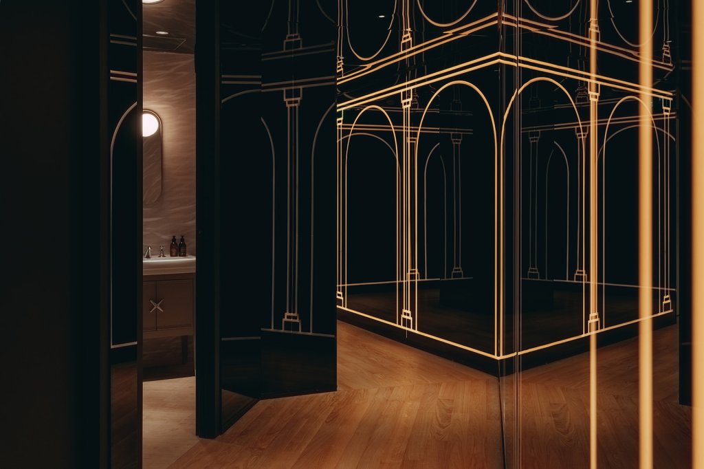 The lobby, the centerpiece of Messine, embodies this approach. Its grand dome, woven like a spider’s web, appears to be suspended in space. Crafted over 7,000 hours by French artisans, it captures and reflects light, creating an ephemeral illusion. The mouldings, reimagined with amplified and surprising proportions, redefine classical design codes. They extend throughout the spaces, offering a striking and innovative interpretation of traditional architectural details.