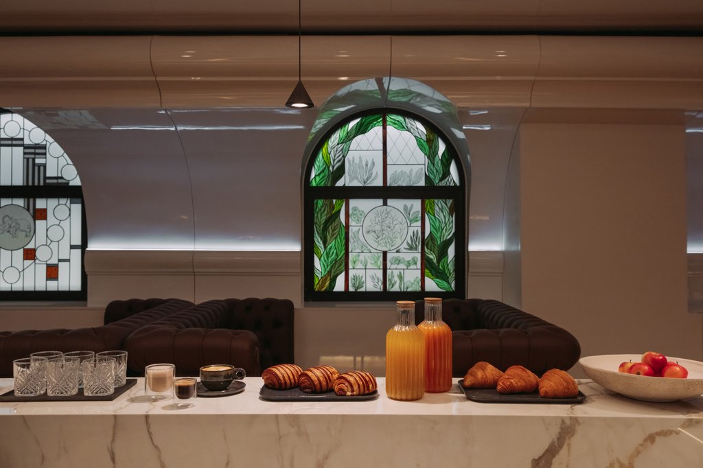 This duality continues in the furniture, carefully selected or designed by Albert Angel. In the lobby, bespoke armchairs combine ceramic with bouclé fabric, blending with the airy textures and diffused light of the dome. Bistro chairs from Kartell collections, upholstered in Emilio Pucci fabrics, enhance this universe. Their vibrant, acid-toned seats interact with the reinterpreted classical architectural elements.