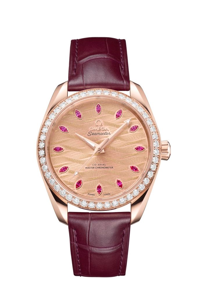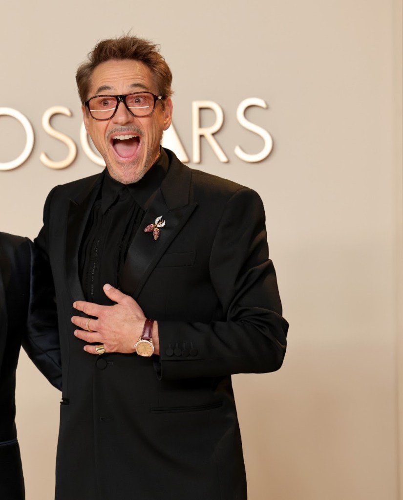 Présentateur lors de la soirée, Robert Downey Jr. portait une Seamaster Aqua Terraen or 18K Sedna™ avec une lunette pavée de diamants, des index en rubis et un bracelet en cuir rouge.