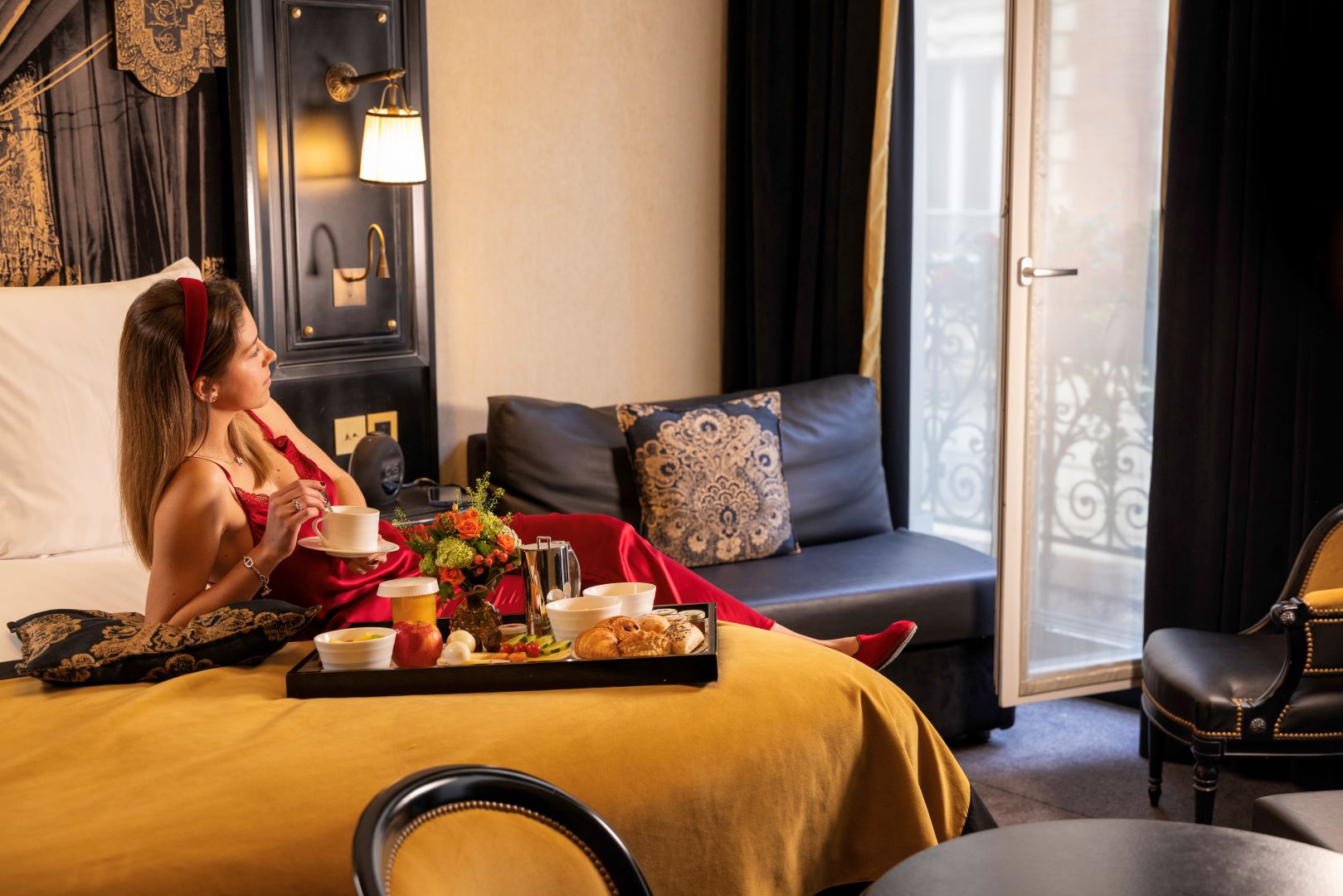 L’hôtel s’illustre par la noblesse des matériaux choisis pour habiller ses chambres. Dans chacune, un lit king size de grande qualité est surplombé d’une tête de lit en velours tendu spécialement réalisée pour Le Belmont Paris et inspirée par les sublimes drapés de l’Opéra Garnier. Le mobilier a été réalisé sur mesure par le menuisier français Henryot et cie, une maison familiale fabriquant des meubles de tradition et d’exception depuis 1867. Ce sont notamment eux qui ont conçu les fauteuils rouges emblématiques de l’Opéra Garnier –un clin d’œil à la décoration Classique des chambres de l’hôtel.