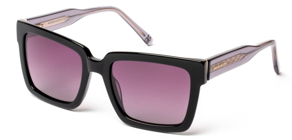 Monture Acétate Noire oversize rectangulaire, avec face en acétate noir épais et des branches dans les tons noirs violets translucides. Les branches larges s’affinent sur l’extrémité, par Banana Moon.