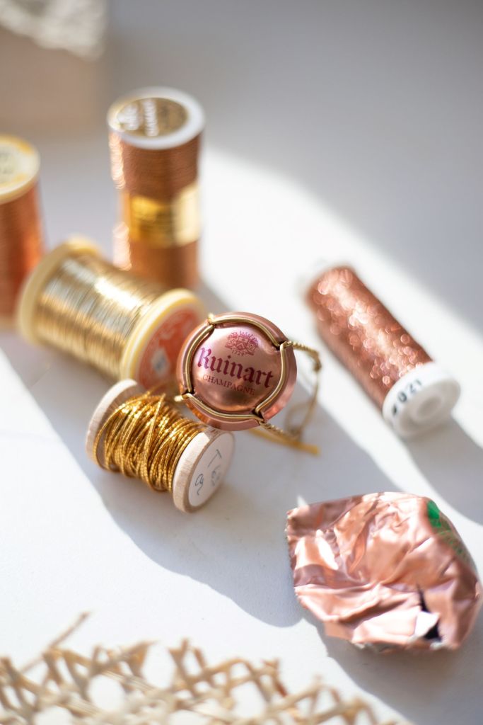 Pour réaliser cette série limitée, Marie Berthouloux puise dans les matériaux issus de la mise en bouteille du champagne Ruinart, tels que le fil doré des muselets le lie de vin et le doré vieilli des coiffes qu’elle transforme en cannetilles et feuilles métalliques enroulées en spirale, illustrant ainsi une démarche de circularité et de réutilisation.