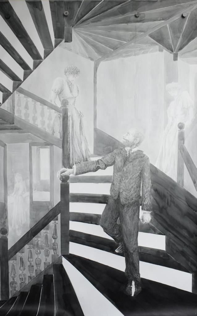Les dessins et les peintures à l’huile qui composent l’exposition ont été réalisés à la plume et au pinceau fin. Des techniques qui permettent de jouer sur les superpositions, les déformations et les jeux de reflets. L’utilisation de la couleur bleue, souvent associée au rêve, permet d’accentuer l’aspect fantomatique et évanescent du souvenir reproduit.