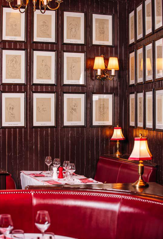 Au rez-de-chaussée, une cinquantaine de places accueillent un bistrot français dans toute sa vérité : banquettes rouges, lumières feutrées, faïence traditionnelle au sol, escalier habillé de moquette rouge. Impossible de s’y tromper, on est bien chez Miocque. Le supplément d’âme réside dans les 118 caricatures des stars qui ont marqué l’histoire du lieu —Alain Delon, Louis de Funès, Jean Gabin…— témoins d’une époque où l’adresse était un passage obligé.